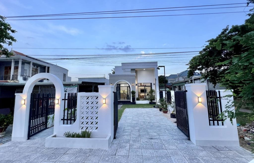 Khuôn viên phía trước được quy hoạch hợp lý với lối đi lát gạch hoa văn, tiểu cảnh xanh mát và hệ thống đèn tường trang trí, mang lại cảm giác ấm cúng và thân thiện. Khoảng sân rộng rãi vừa tạo không gian đệm cho ngôi nhà, vừa thuận tiện cho việc để xe hoặc tổ chức các hoạt động ngoài trời.