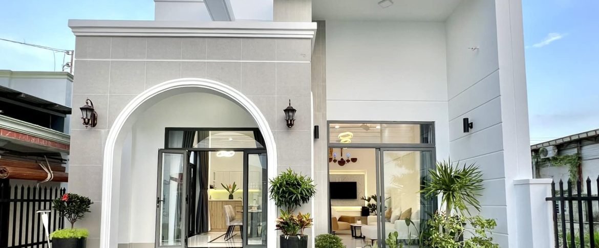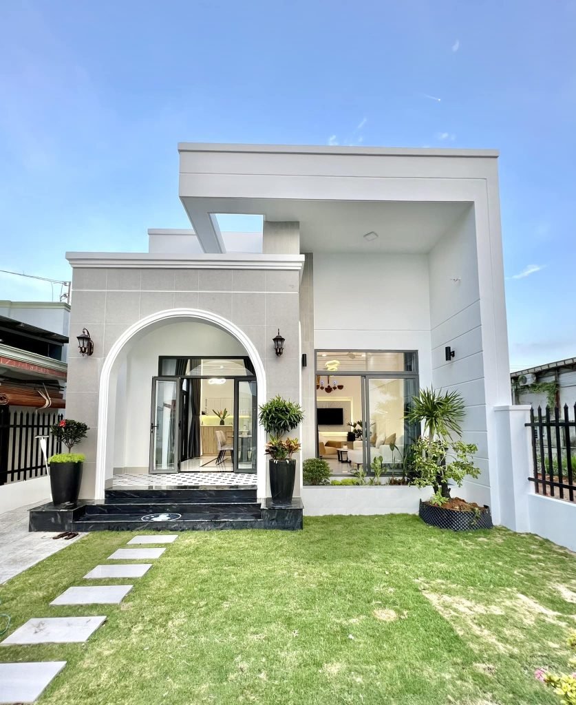 Thiết kế mặt tiền là điểm nhấn ấn tượng với vòm cong mềm mại kết hợp cùng các khối kiến trúc vuông góc, tạo nên sự hài hòa giữa nét hiện đại và cổ điển. Chi tiết này không chỉ tăng tính thẩm mỹ mà còn giúp ngôi nhà có chiều sâu và sức hút riêng biệt so với các mẫu nhà phố thông thường.
