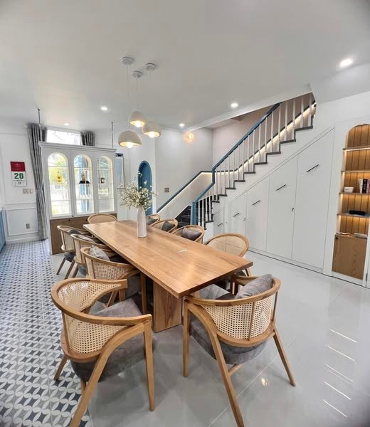 Bàn ăn gỗ tự nhiên lớn với thiết kế đơn giản nhưng sang trọng là điểm nhấn quan trọng trong không gian sinh hoạt chung. Ghế mây kết hợp đệm êm ái vừa tạo sự thoải mái vừa tôn lên vẻ đẹp tự nhiên, ấm áp của nội thất.